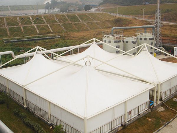 膜结构污水池加盖是一种新型的处理污水池废气的方法,这种方法不仅结构新颖,而且造型优美,安装,维修方便,充分发挥了膜结构建筑的优势。膜结构污水池加盖是以钢结构为主,将膜材反吊的形式进行污水池废气除臭。膜结构污水池加盖作为新型的污水池废气除臭方法,在膜材性能,结构安装和施工方面都具有很大的优势: