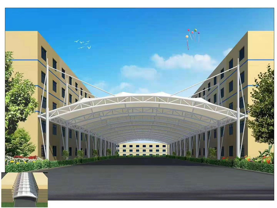 膜结构车棚的篷布采用PVC/PVDF/PTFE/ETFE,而膜材的最大特点是强度高、耐久性好、防火难燃、自洁性好,不受紫外线影响,使用寿命长,一般15-30年。具有高透光率,透光率为13%,对热能反射率73%,热吸收量很少。正是因为这种划时代的膜材料的发明,使膜结构车棚成为现代化的永久建筑。